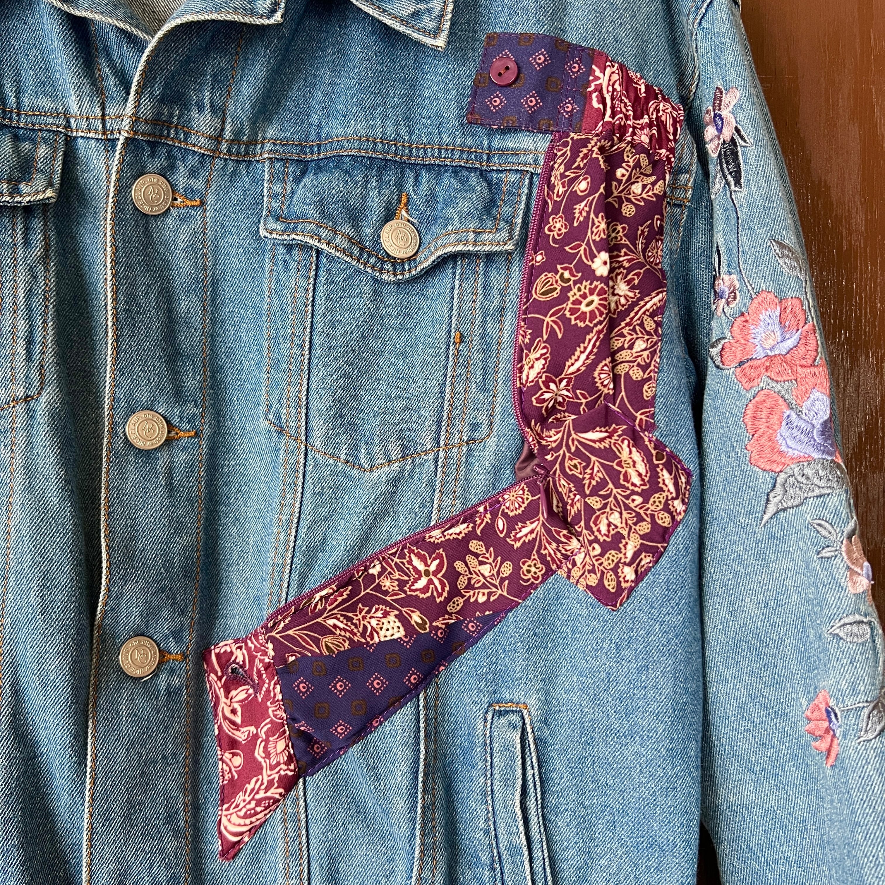 花柄のシャツとスカートを解体し、デニムジャケットに縫い合わせました。
