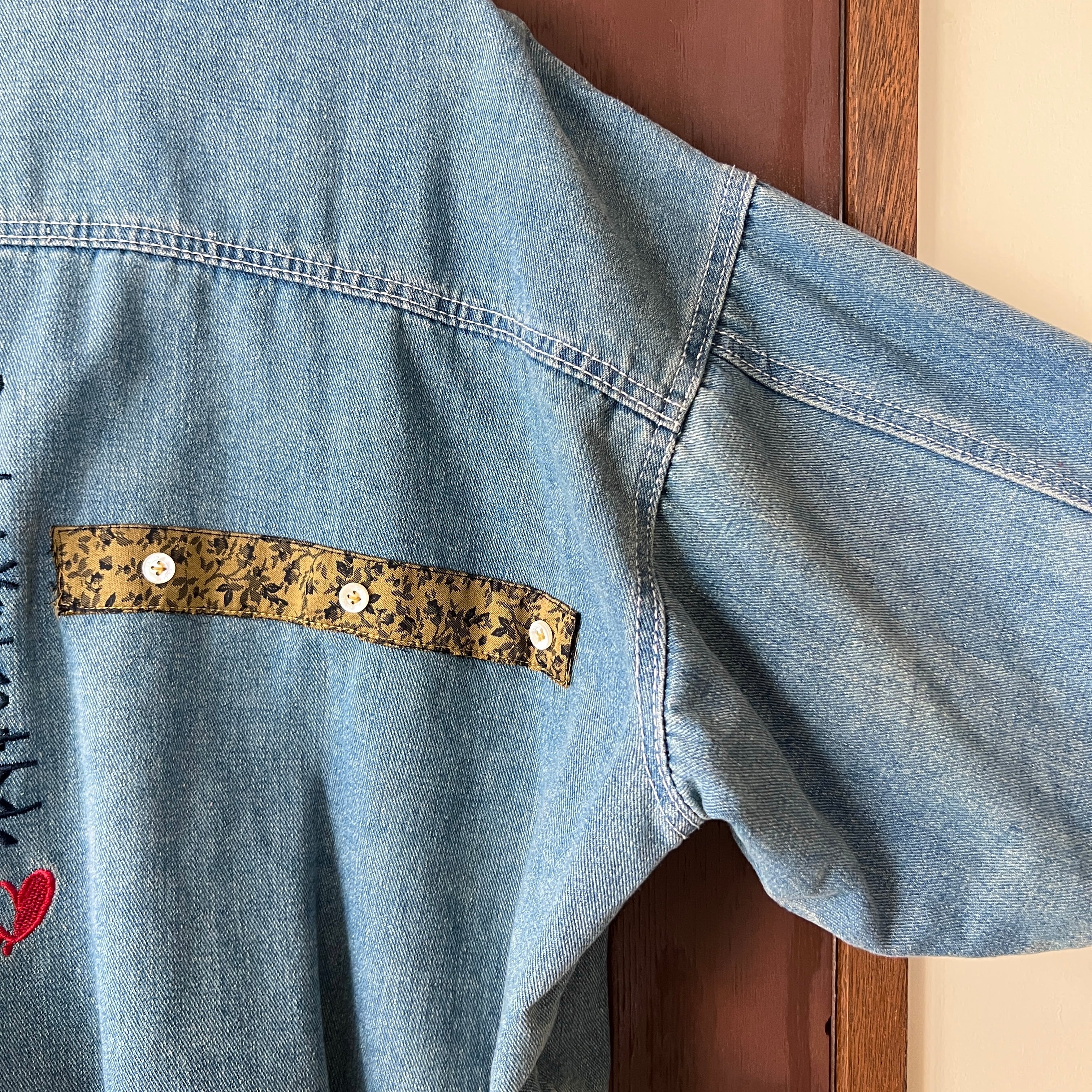 花柄やペイズリー柄などのボトムやシャツを解体しデニムジャケットに縫い合わせました。