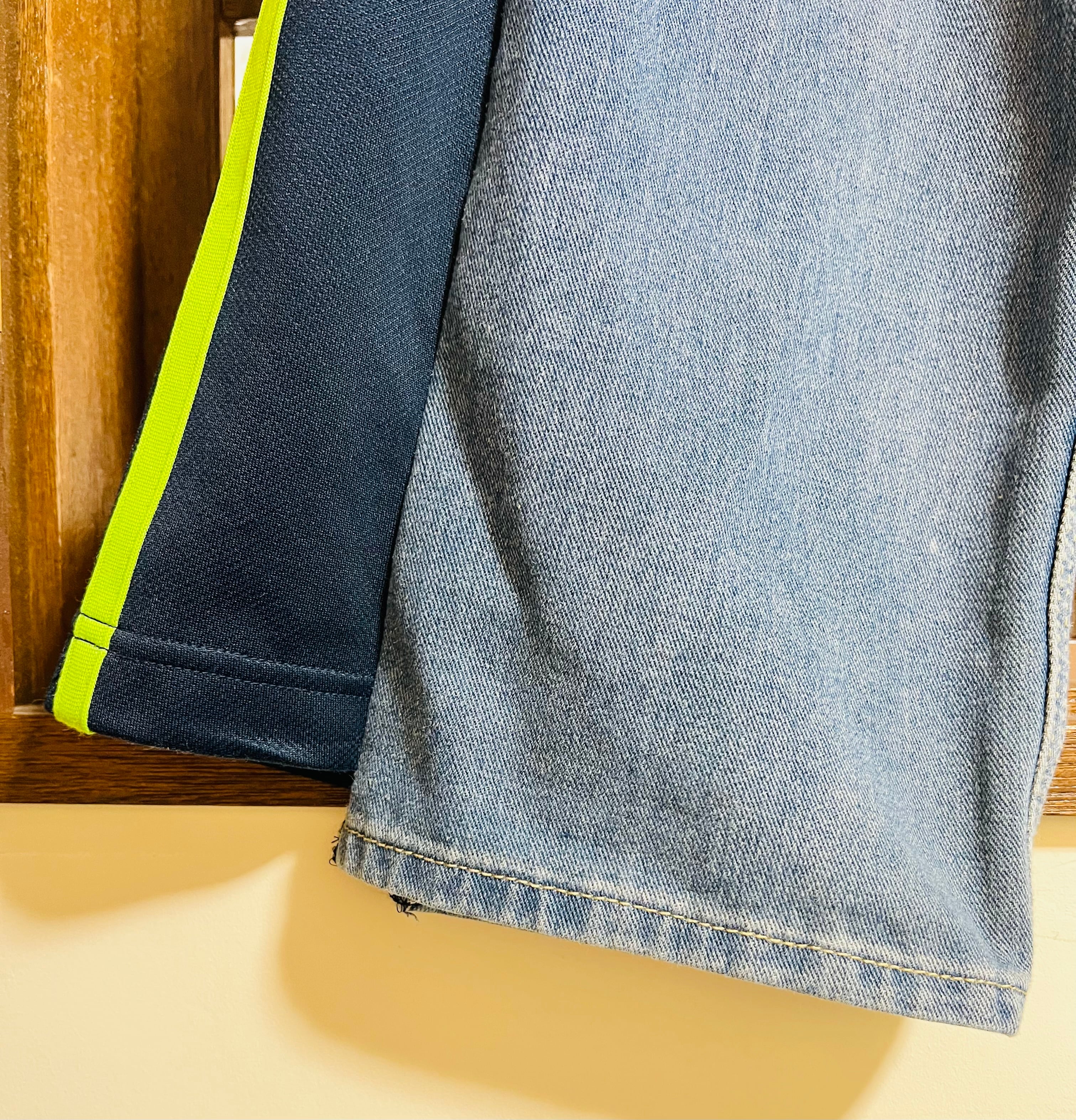 ジーンズとトラックパンツをドッキングしたワイドバギーパンツです。
