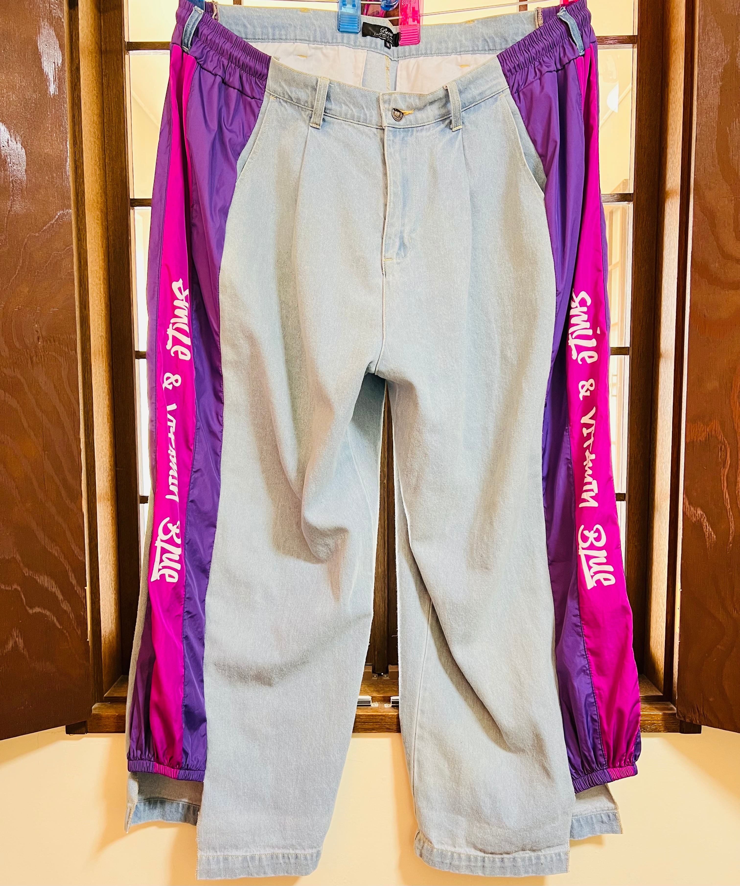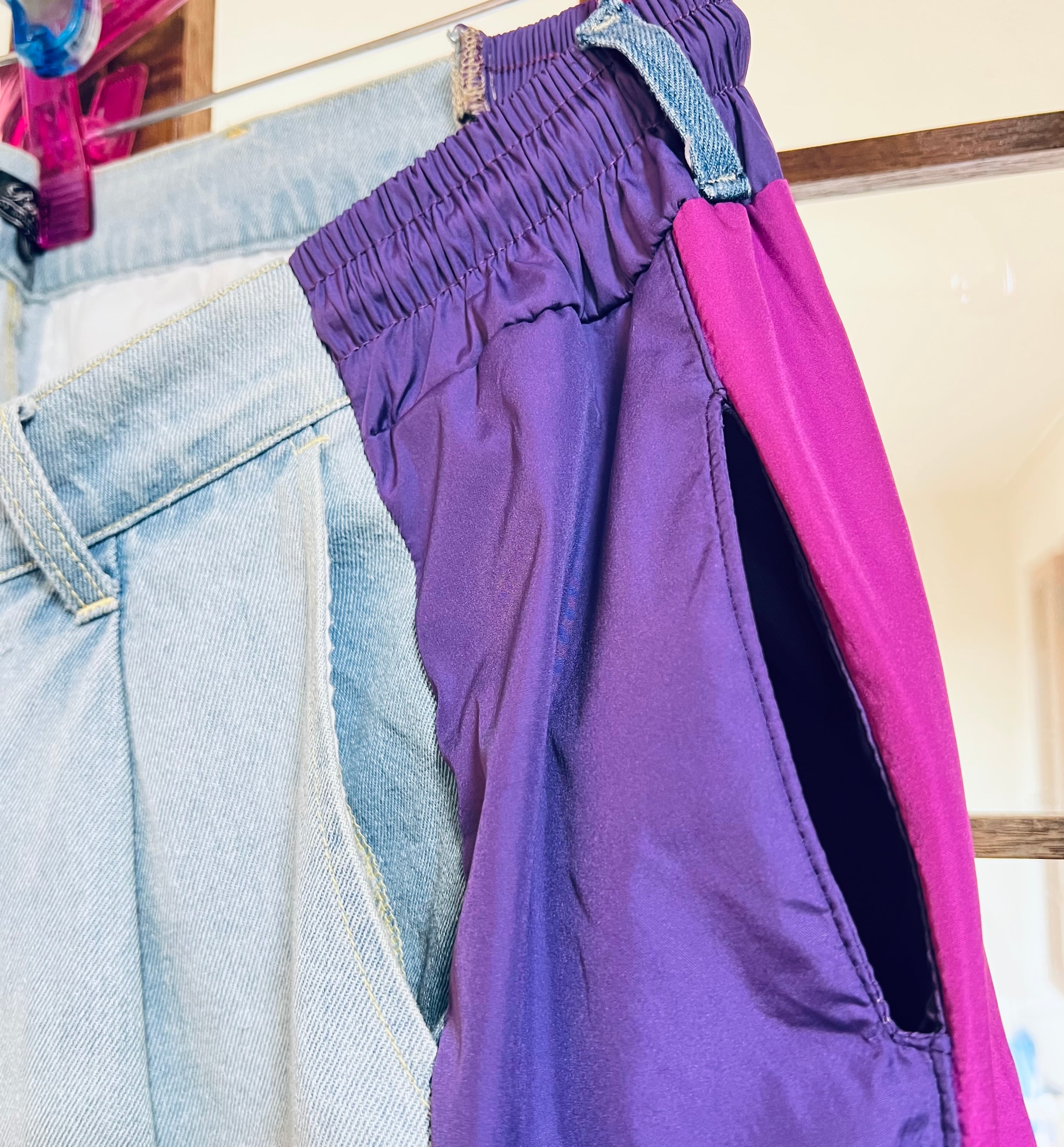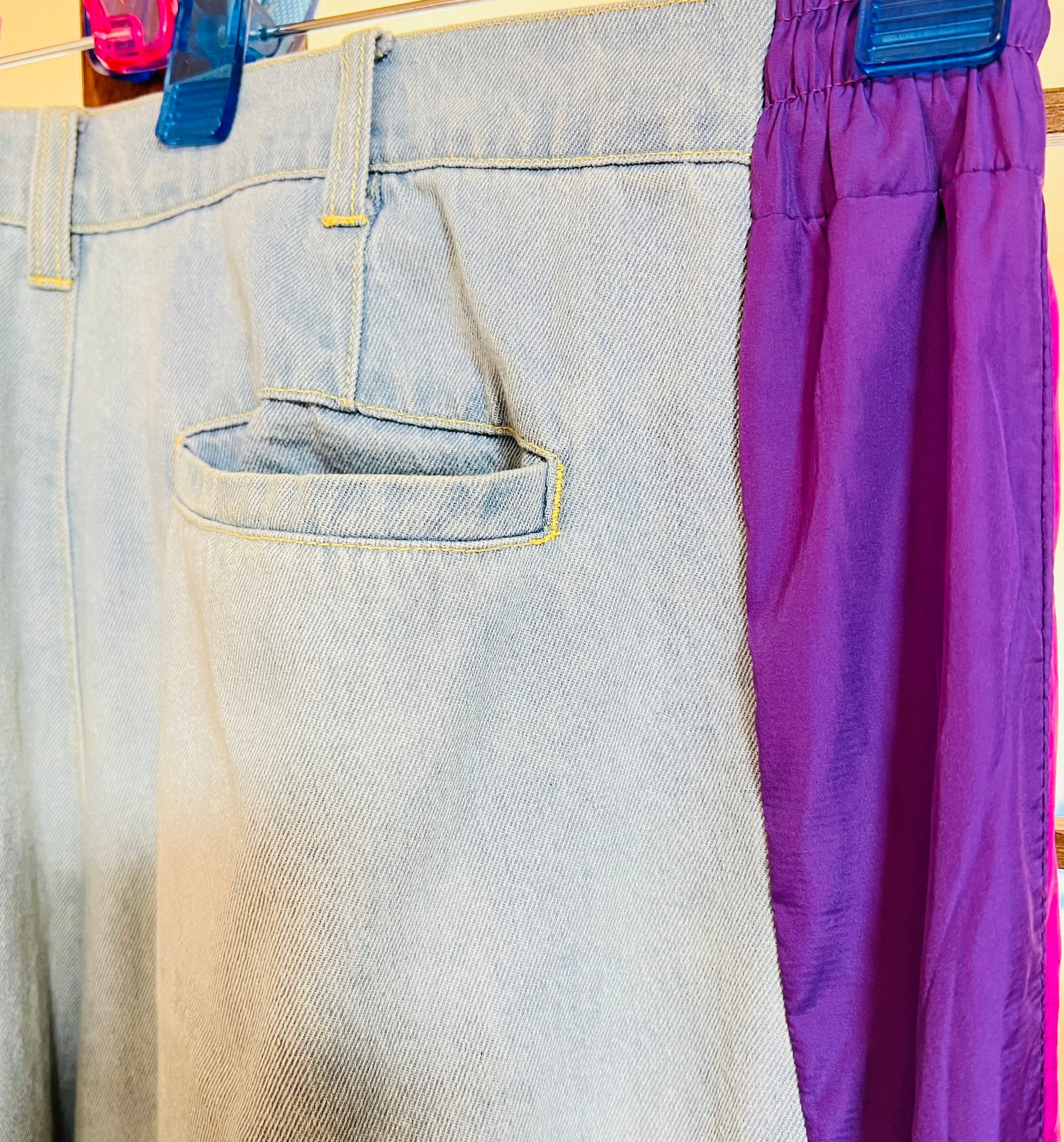 ジーンズとトラックパンツをドッキングしたワイドバギーパンツです。