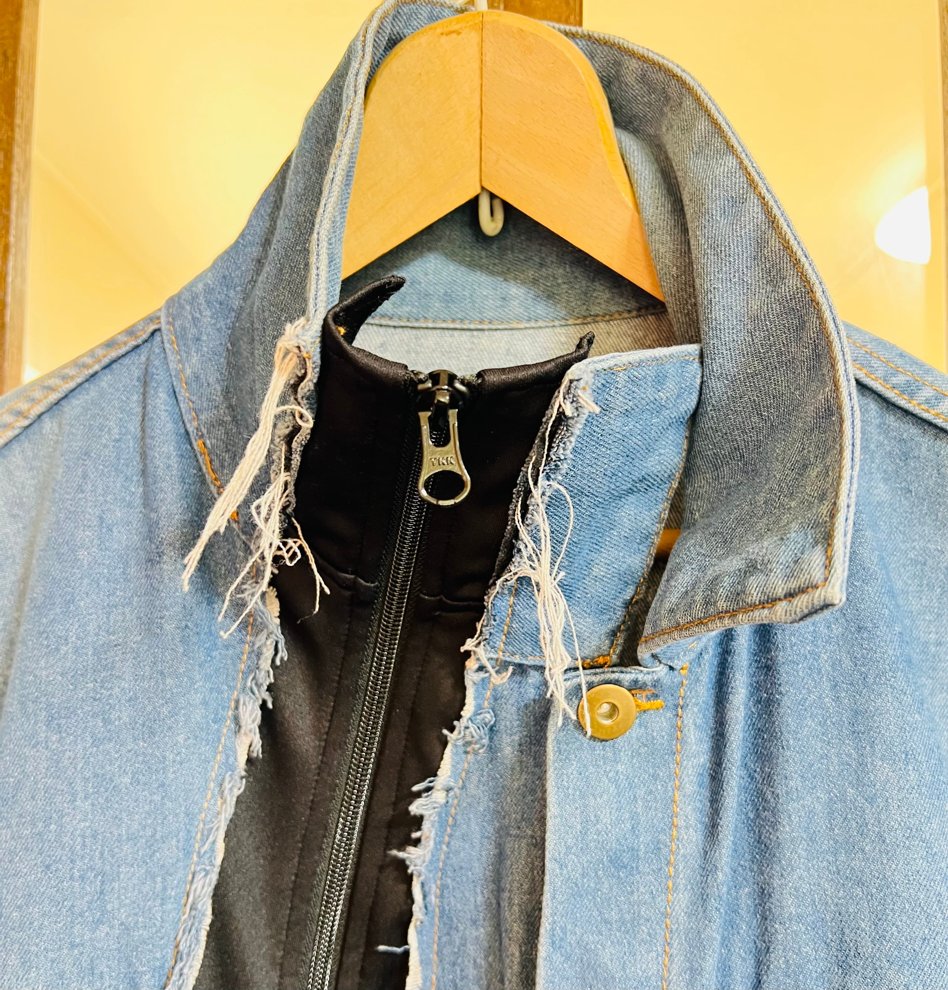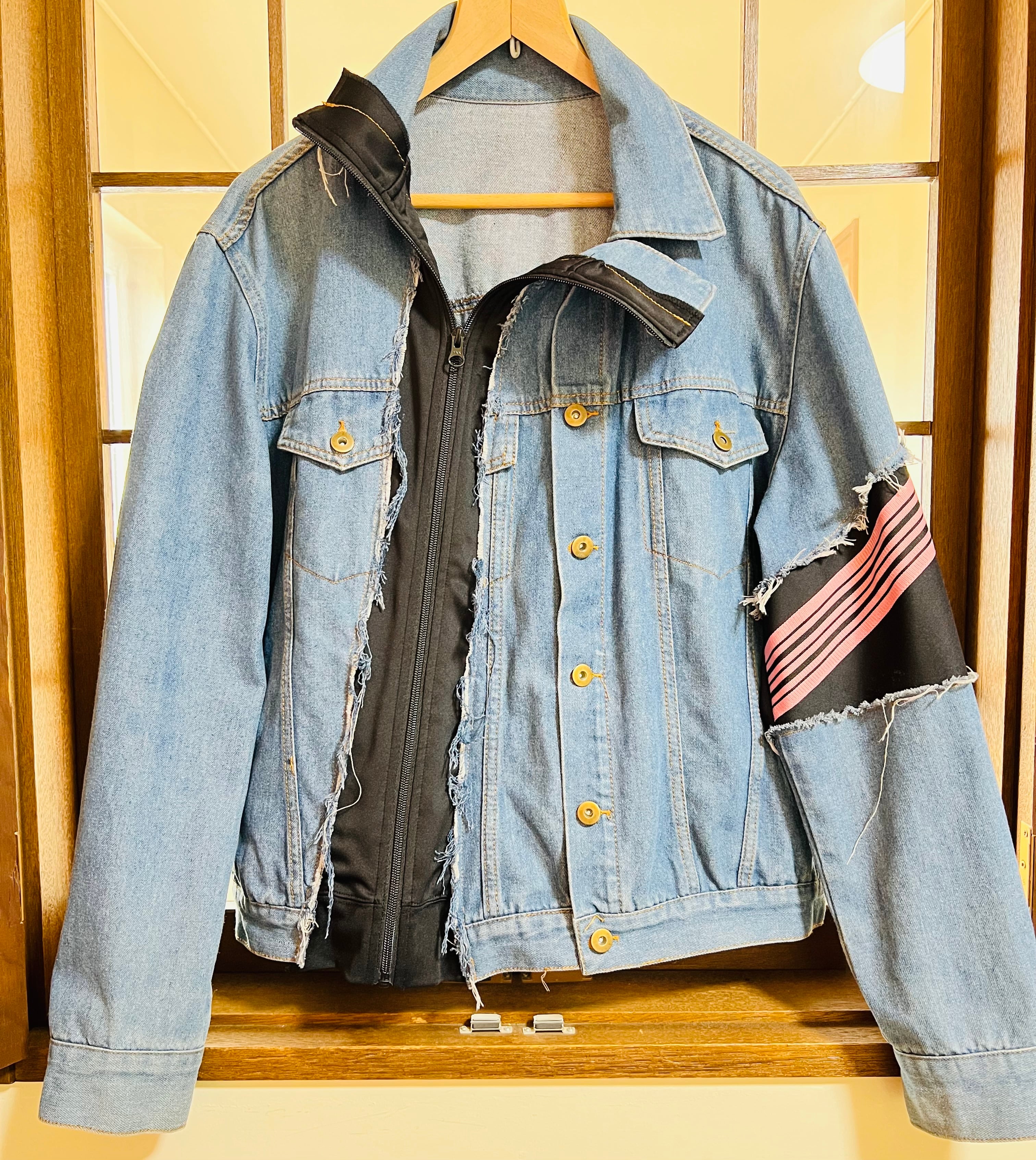 デニムジャケットを解体しトラックジャケットを差し込んだ再構築ジャケット。