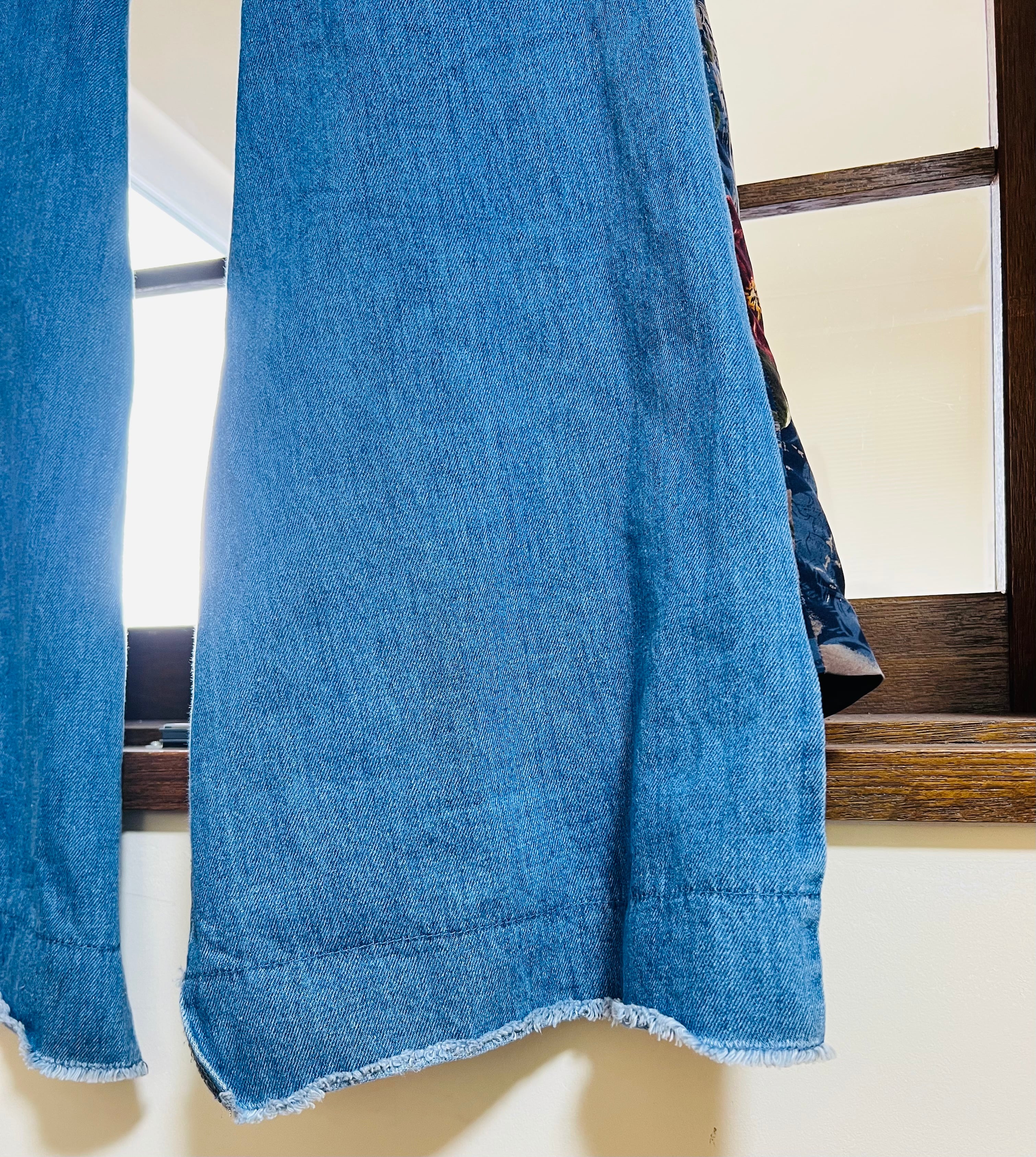 裾は段違いになっており、デニム部分はカットオフ(切りっぱなし)になっています。
