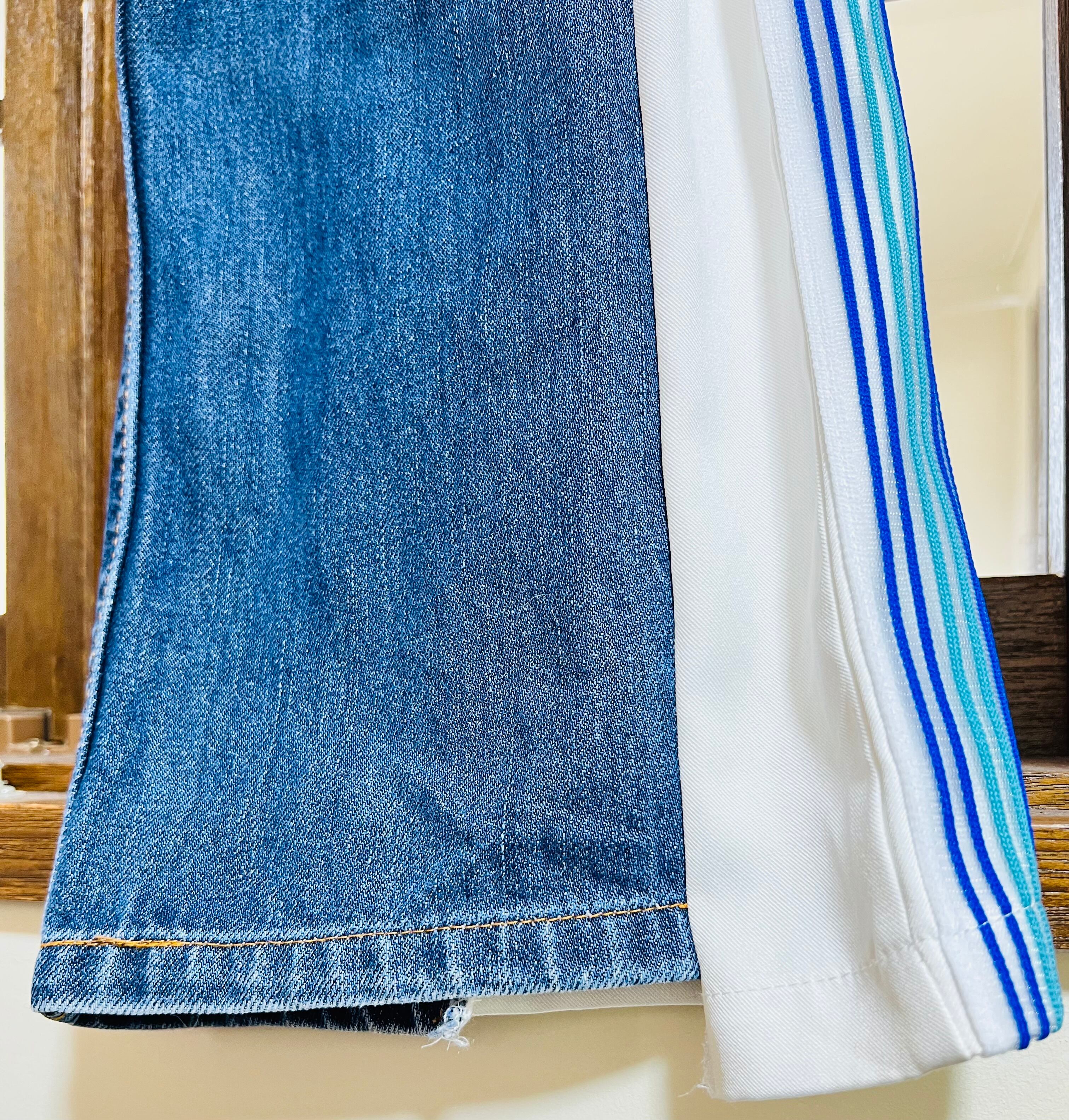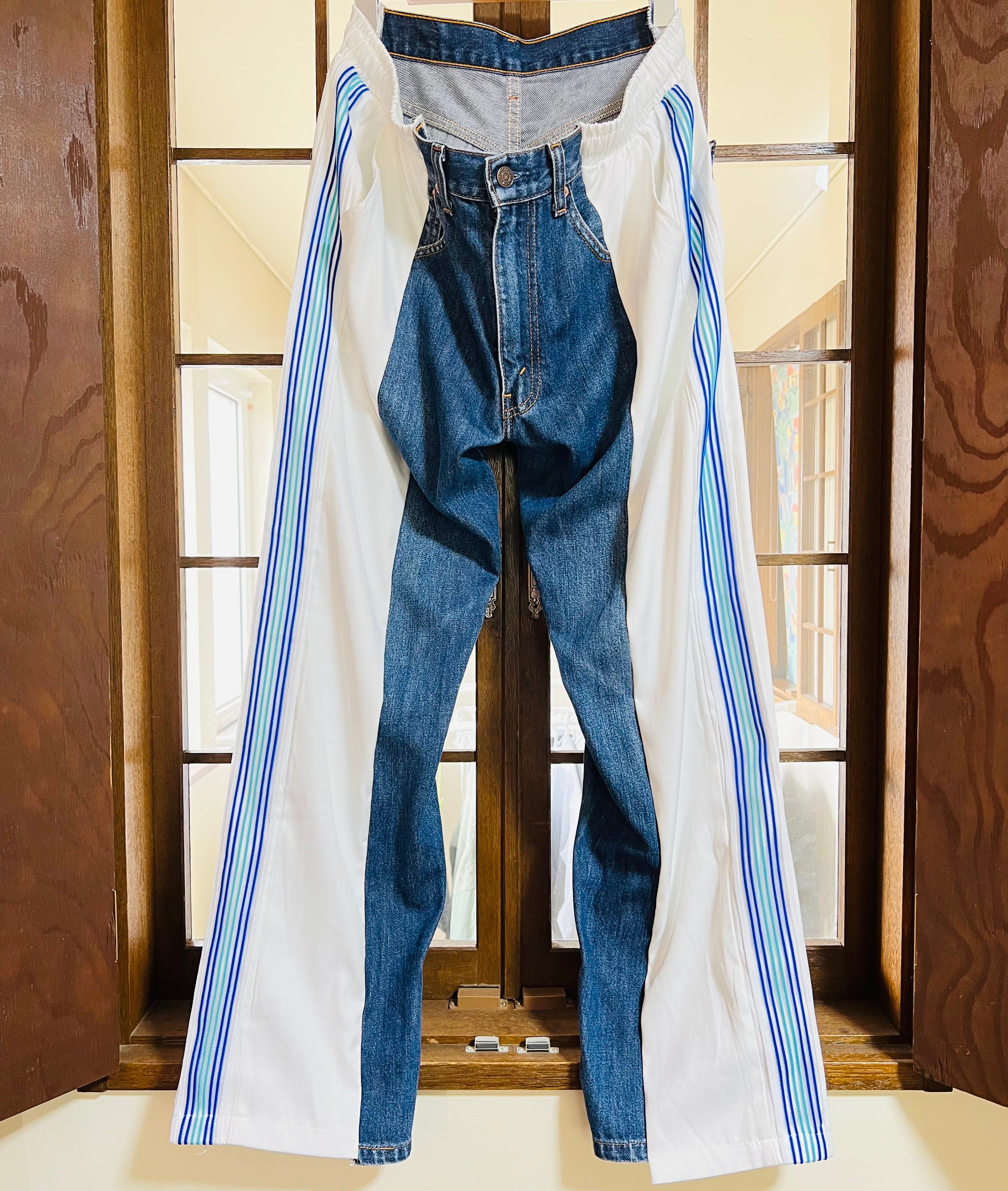 ジーンズとトラックパンツをドッキングしたワイドパンツです。