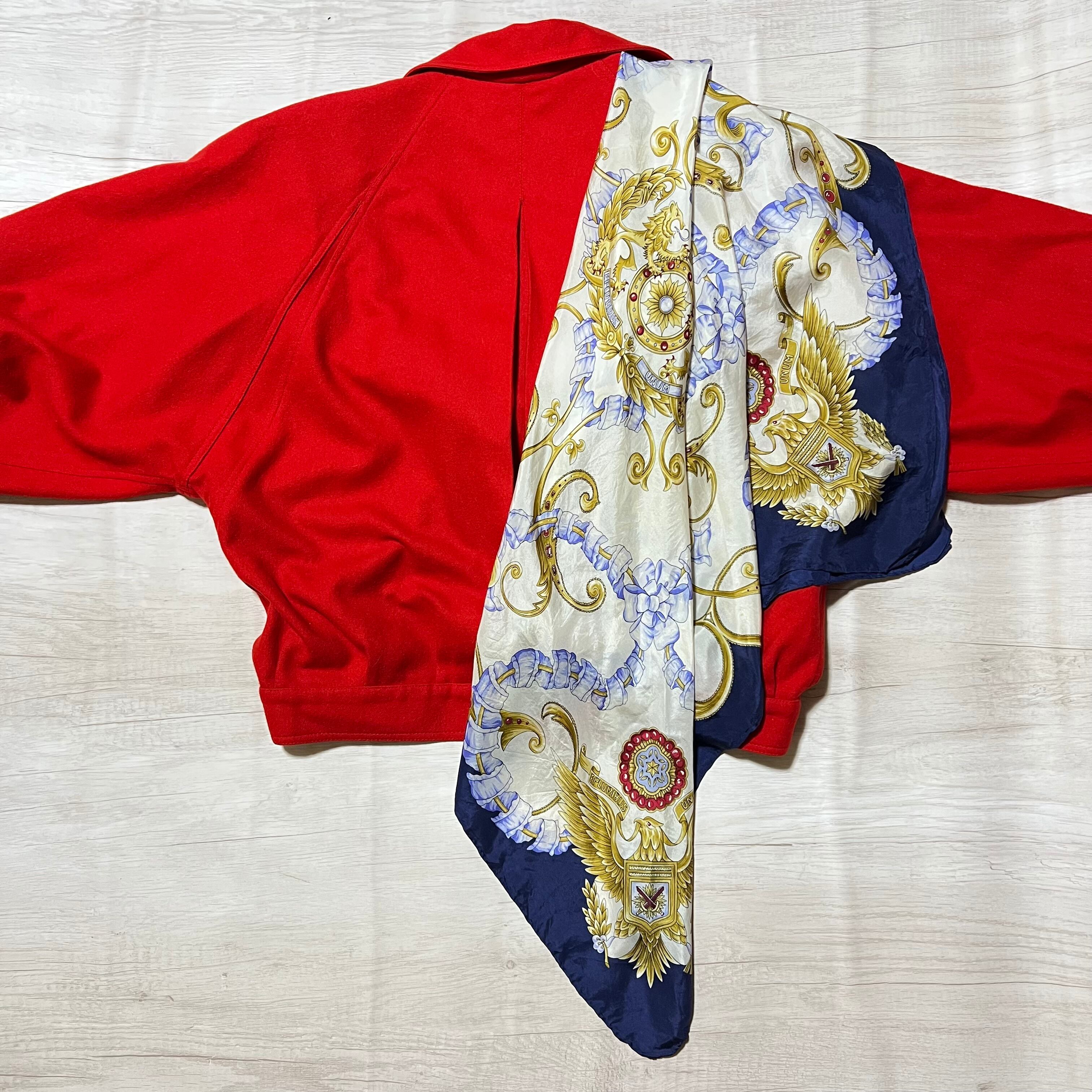 肩パッド入りジャケットの形もスカーフの柄もレトロなものを使用しています。