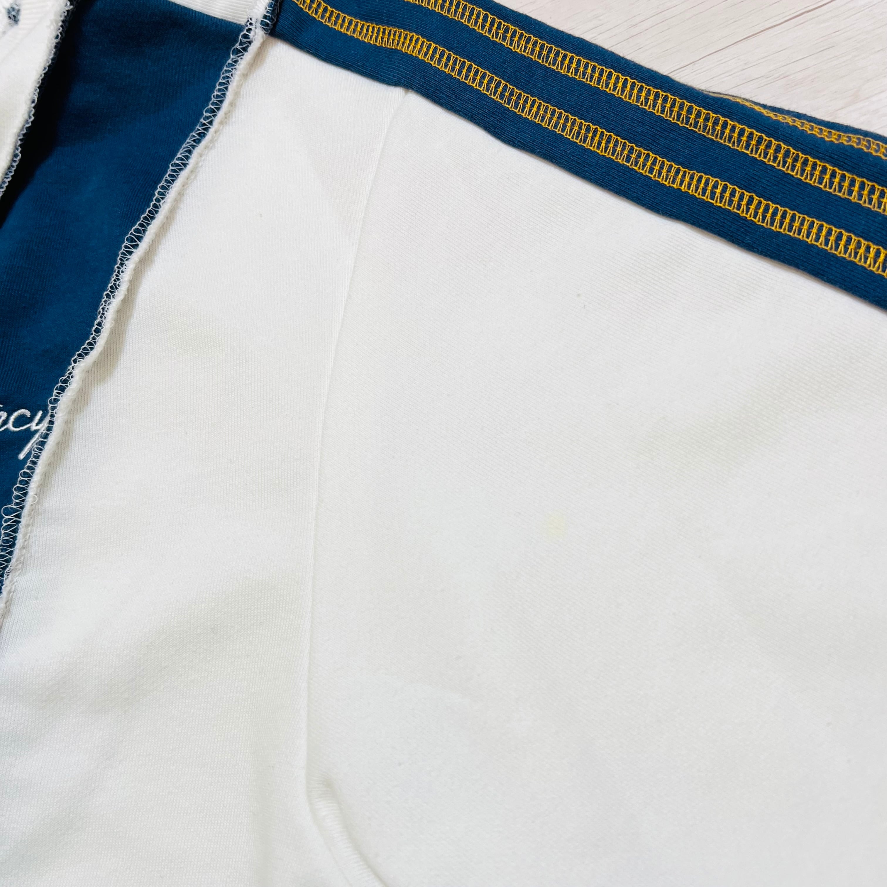 写真13枚目の左袖部分に黄色いシミがあります。状態をよく確認したうえでご検討ください。
